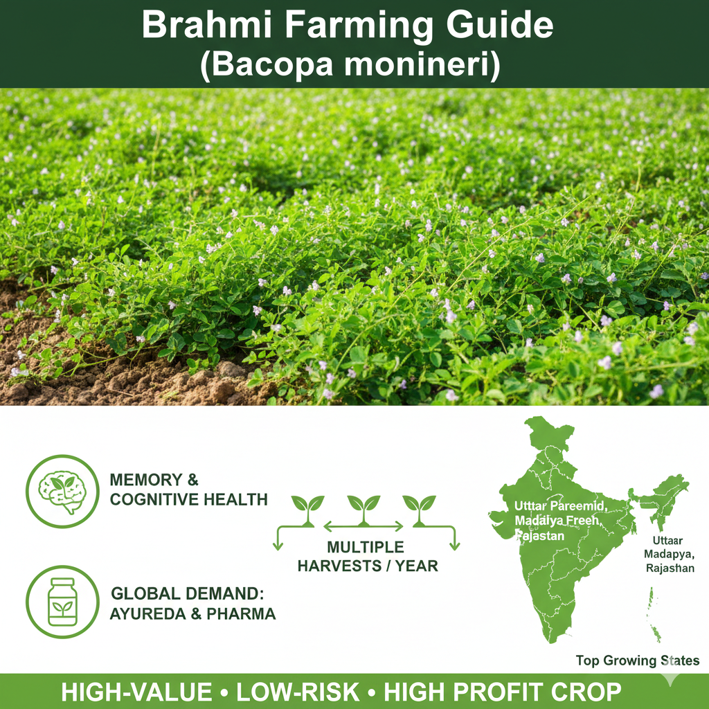 Brahmi crop farming is a highly profitable, sustainable, and future‑ready medicinal farming option for Indian farmers. With strong demand from ayurvedic, pharmaceutical, and nutraceutical industries, Brahmi offers assured market potential. Adoption of scientific cultivation practices, balanced nutrient management, and integrated pest management can help farmers achieve consistent yields and long‑term income stability.