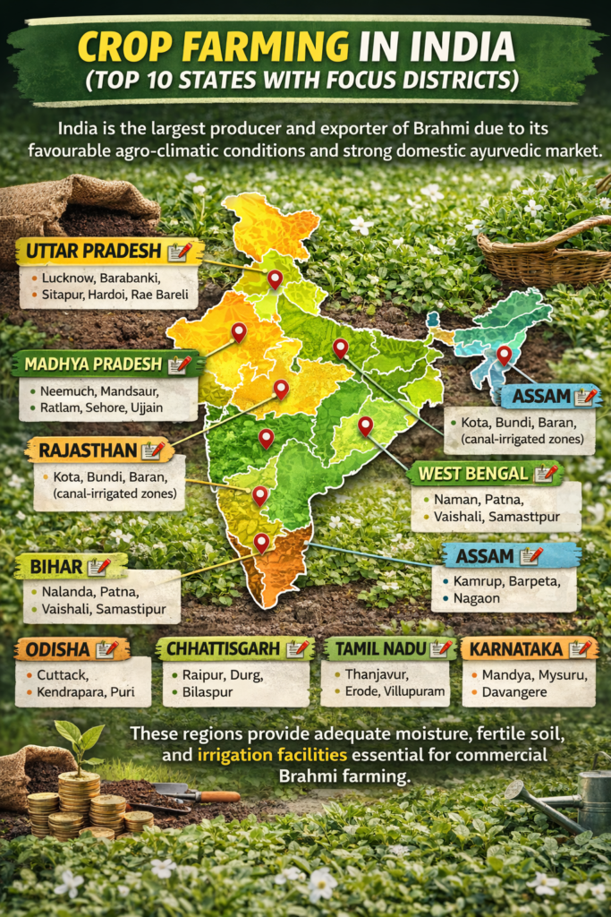 These regions provide adequate moisture, fertile soil, and irrigation facilities essential for commercial Brahmi farming.