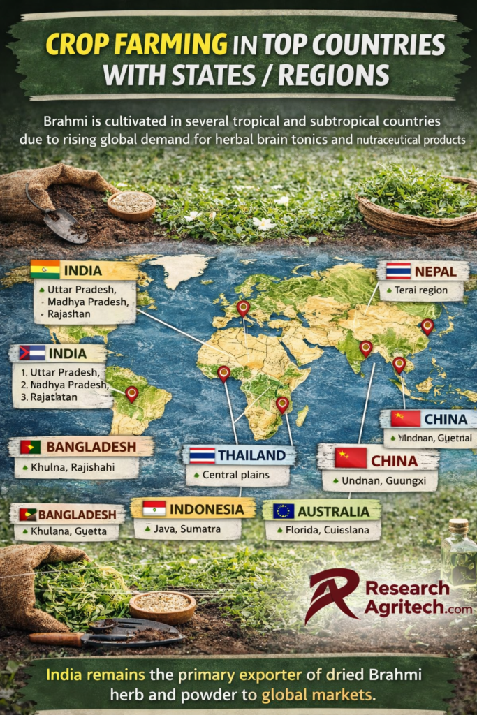 Brahmi is cultivated in several tropical and subtropical countries due to rising global demand for herbal brain tonics and nutraceutical products.