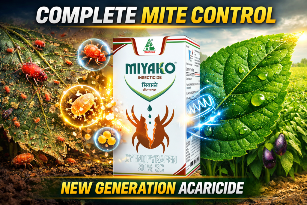 To overcome this issue, farmers need a next-generation solution that provides complete control over mites at all life stages, performs effectively even under high temperature conditions, and ensures crop safety. Dhanuka MIYAKO® is one such advanced acaricide designed to deliver superior mite control, enhanced crop vigor, and higher profitability.