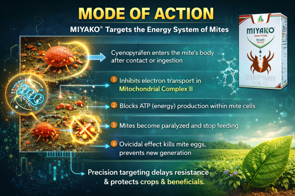 Ans. MIYAKO® blocks ATP formation, causing paralysis, feeding stoppage, and death of mites.